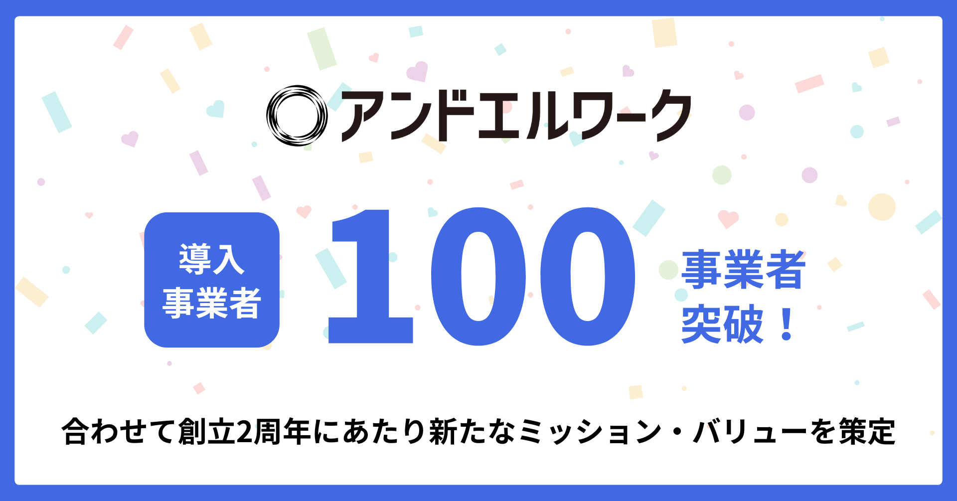 アンドエル株式会社(本社:東京都港区、代表取締役:古橋智史)は、法人向け健康支援サービス「アンドエルワーク」の導入事業者数が100事業者を突破したことをお知らせいたします。また、2025年10月17日に創立2周年を迎えるにあたり、新たなミッション・バリューを策定いたしました。