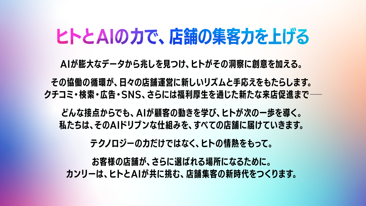 コロナ禍を経て、店舗を取り巻く環境は大きく変化しましたが、そこで改めて感じたのは "人が主役であること" です。AIが進化する時代だからこそ、ヒトの判断・想い・工夫を支えるテクノロジーが必要だと考えています。 今回の資金調達を通じて、ヒトとAIの力で店舗を支える仕組みを進化させ、店舗経営をより持続可能で創造的なものにしていきます。 また、新しいビジョン「ヒトとAIの力で、店舗の集客力を上げる」には、店舗の売上や成果に直結する領域から真正面に向き合う覚悟を込めました。 カンリーはこの "第2創業期" を通じて、AI推進・人材採用・海外展開を一層加速し、世界中の店舗産業を支えるインフラ企業として挑戦を続けてまいります。