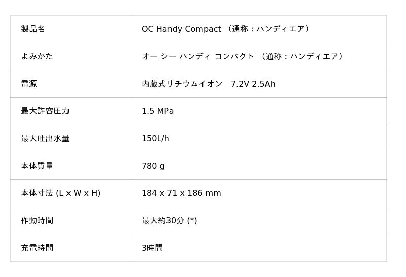 「OC Handy Compact(通称:ハンディエア)」は、従来の高圧洗浄機の設置や準備にかかる手間を軽減し、より手軽に日常で使うための製品として開発されました。水道の約7.5倍の圧力となる最大許容圧力1.5 MPaの洗浄力※を備え、手のひらサイズの携行性と折りたためる収納性を実現しています。電源・水源を気にせずどこでも使えるため、アウトドアやレジャーなど、場所に縛られない幅広い洗浄ニーズに対応します。