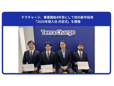 電気自動車(EV)向け充電サービス「Terra Charge(テラチャージ)」を展開するTerra Charge株式会社(本社:東京都港区、代表取締役社長:徳重 徹、以下「当社」)は、このたび内定式を実施いたしました。2022年4月に事業を立ち上げた後、4年目にして初の新卒採用となります。