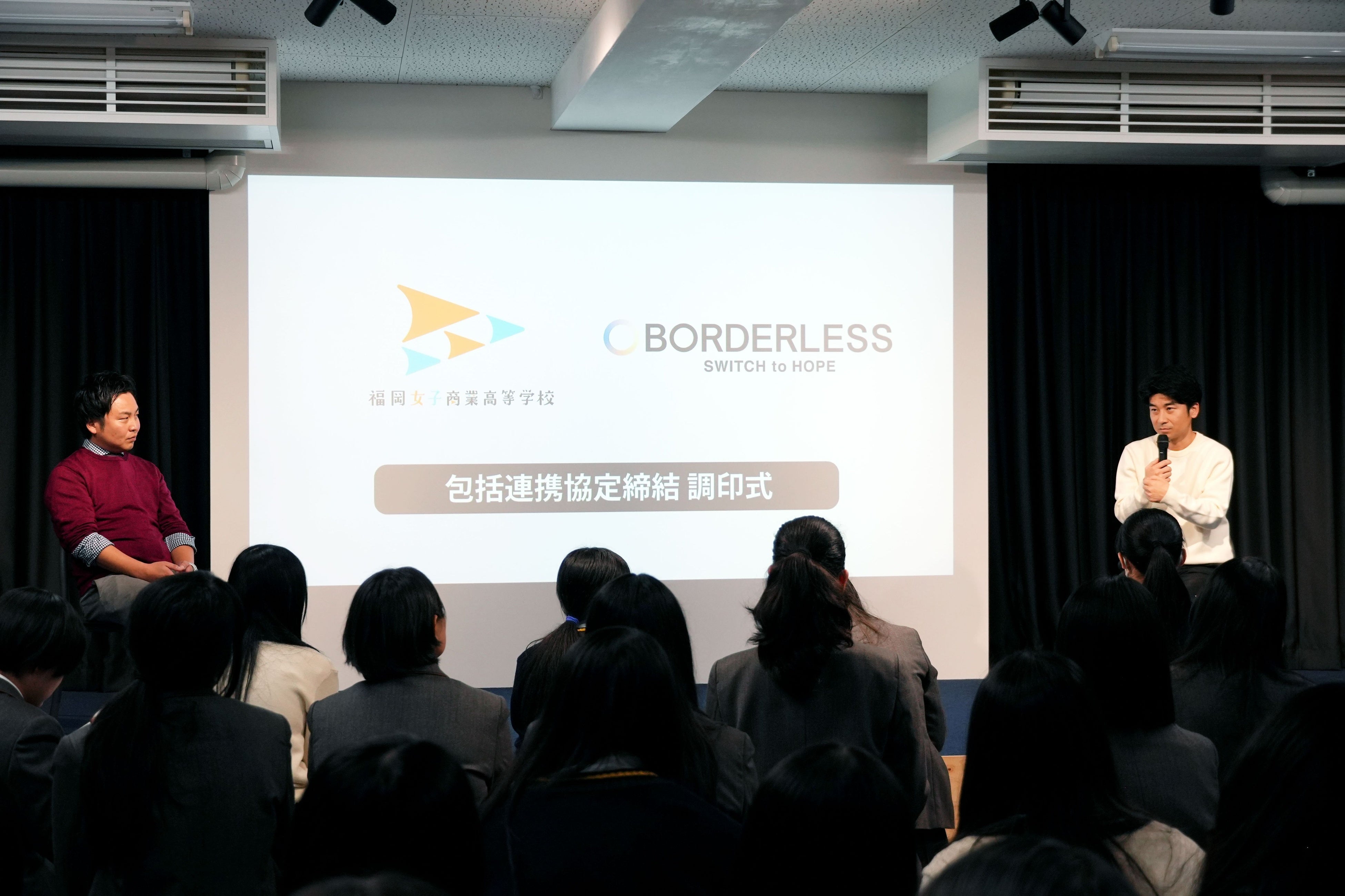 締結当日には、福岡女子商業高等学校にて調印式および記念講演が開催され、校長の柴山翔太氏とボーダレス・ジャパン代表の田口一成が登壇。「社会に希望を生み出す、これからの教育とビジネスのカタチ」をテーマに、生徒たちに向けて熱いメッセージを送りました。