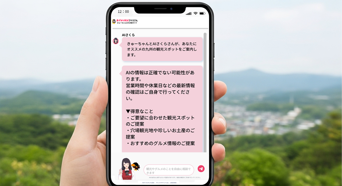本取り組みでは、九州観光公式アプリ「きゅーちゃんのわくわく九州塾」(Google Play・App Store)および公式Webサイト上で、AIさくらさんが観光ナビゲーターとして登場。利用者がスマートフォンを開くと、画面上に九州観光機構の公式キャラクター「きゅーちゃん」と「AIさくらさん」が並んで登場し、まるで現地のスタッフに話しかけるように観光情報を教えてくれます。