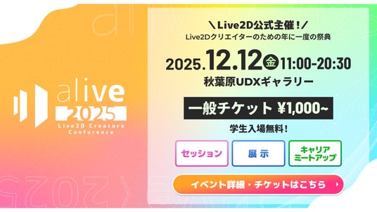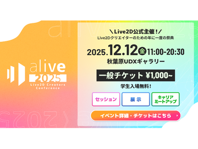 2Dイラストに立体的なアニメーションを加える表現技術「Live2D(ライブツーディー)」の研究開発を中心に事業を展開している株式会社Live2D(本社:東京都新宿区、代表取締役:中城哲也、以下、Live2D社)は、2025年12月12日(金)に開催するLive2D社主催イベント『alive 2025』のイベントコンテンツ情報を公開しました。