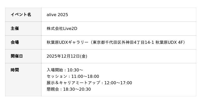 『alive 2025』のメインコンテンツである「セッション」、「展示」、「Live2Dキャリアミートアップ!」の情報を公開します!
