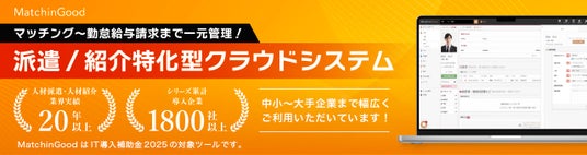 「MatchinGood」は、人材派遣・人材紹介事業における業務を一元管理し、業務効率化と売上向上を実現するクラウド型の管理システムです。求人・求職者情報から契約、売上までを一気通貫で管理し、事業の成長を力強くサポートします。