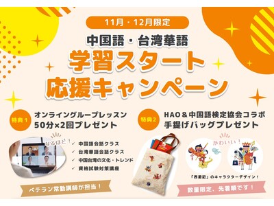 株式会社イーオン(本社:東京都新宿区、代表取締役社長:重野卓、以下「イーオン」)が運営するハオ中国語アカデミーは、2025年11月1日(土)から12月27日(土)までの期間、「中国語・台湾華語 学習スタート応援キャンペーン」を実施いたします。これから中国語を学びたい方、学び直したい方に向けて、通学/オンラインを対象としており、どちらでも気軽に始められるキャンペーンです。