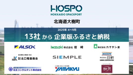北海道大樹町(町長:黒川豊)とSPACE COTAN株式会社(本社:北海道広尾郡大樹町、代表取締役社長兼CEO:小田切義憲)は、民間にひらかれた商業宇宙港「北海道スペースポート(HOSPO)」プロジェクトの資金として、2025年4月から9月までの間に、北海道内外の13社から企業版ふるさと納税の寄附をいただいたことをお知らせいたします。