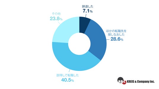 反対された方の決断としては、「説得して転職した」が40%でトップとなりました。企業規模や一時的な収入ダウンへの家族の不安な意見には、しっかりと説明を行って自身の選択を実現する方が多いと言えます。一方で、「辞退した」は7%、「ほかの転職先を探しなおした」は28%となっており、反対された企業を選ばなかった割合も36%を占める結果となりました。家族の意見を重視し、ご自身の決断に影響を与えるケースも少なくないことがわかります。