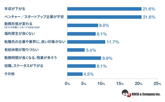 反対されたことがある方に理由を聞いたところ、「年収が下がる」「ベンチャー/スタートアップ企業が不安」が21%でトップとなりました。次いで「転職先の企業や業界に良い印象がない」が12%で続きます。