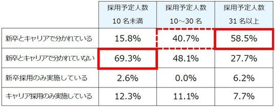 現在、企業のキャリア採用はどのような体制で行われているのか。新卒採用担当者とキャリア採用担当者の分担について訊ねたところ、採用予定人数が10名以上になると、キャリア採用の専任担当者をおく企業が4割を超え(40.7%)、採用予定人数が31名以上になると、キャリア採用の専任担当者をおく企業が多数派(58.5%)との結果となった。