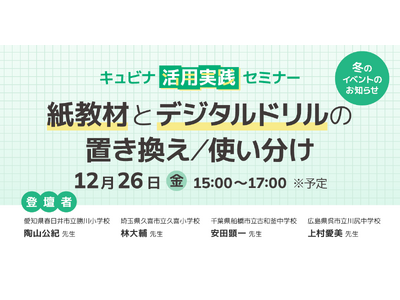 紙教材とデジタルドリルの置き換えや使い分けに関する工夫や成果、課題までも率直にお話しいただくオンラインセミナー「先生に学ぶ!キュビナ活用実践セミナー 紙教材とデジタルドリルの置き換え/使い分け」を開催いたします。