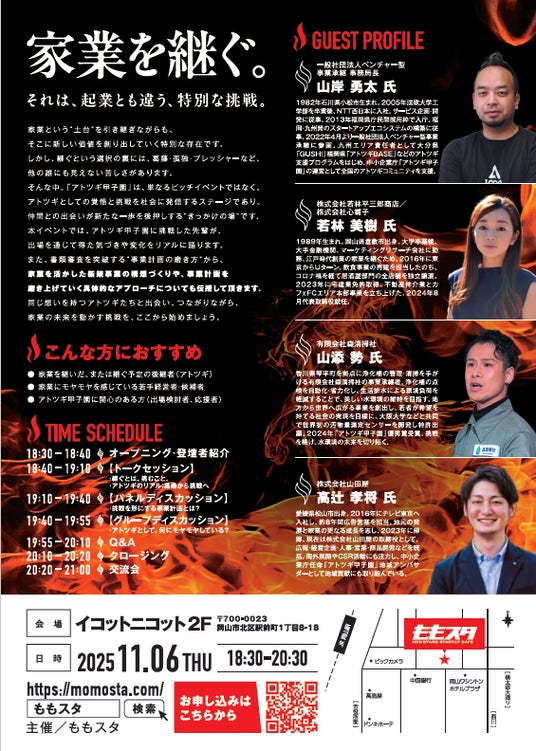 「アトツギ甲子園」出場経験者・関係者4名が、出場を通じて得た気づきや変化をリアルに語ります。トークセッションやグループディスカッションを交えながら事業計画の磨き方や家業を活かした新規事業の構想づくりなど具体的なアプローチを実施します。また、イベント後にはももスタにて、様々な業種・属性の方との交流ができる時間を設けています。