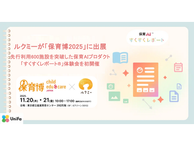 保育AI(TM)を中心としたテクノロジーの力で保育や子育てに関する社会課題を解決するユニファ株式会社(本社:東京都千代田区、代表取締役CEO:土岐泰之、以下「ユニファ」)が提供する保育総合ICTサービス「ルクミー」は、2025年11月20日(木)・21日(金)の2日間で開催される「保育博2025」に出展します。今回の出展が6回目となるルクミーブースでは、β版の提供を経て2025年10月に正式に提供を開始した保育AIプロダクト「すくすくレポート(R)」のデモ機を用いた体験会を初めて実施します。