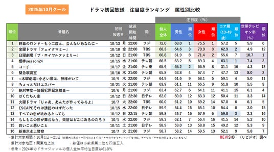 ご家庭に人体認識技術を搭載した機器を設置し、テレビスクリーンへの「アテンション(注視)」を測るREVISIO株式会社(本社:東京都千代田区、代表取締役社長 郡谷康士、以下REVISIO)は、2025年10月にスタートした秋ドラマについて、初回放送の注目度ランキングを作成し、人気の傾向を分析致しました。注目度が高いほど、テレビの前の視聴者がくぎづけになっていたことを表します。