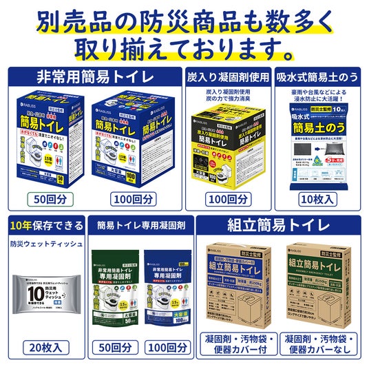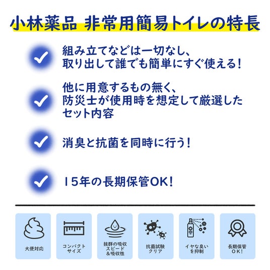 組み立ての必要がなく、すぐに使える簡易トイレです。15年の長期保管が可能!日本国内での消臭・抗菌試験にも合格した凝固剤を採用しているため、清潔にお使いいただけます。フック陳列にも対応したパッケージで店頭販売用としても活用できるタイプです。