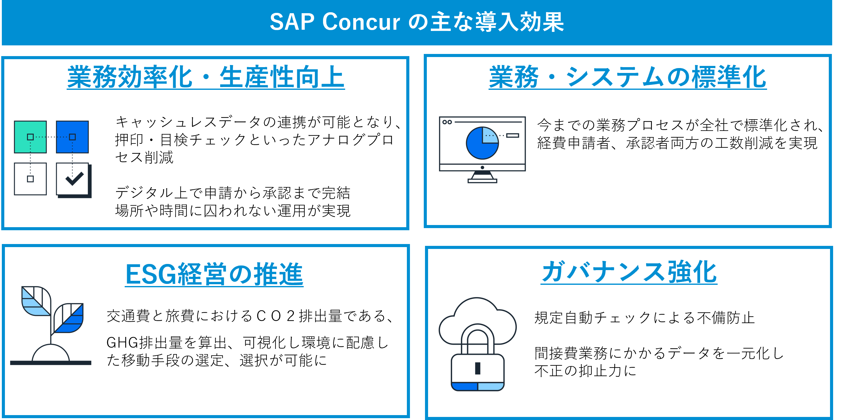 SAP Concurの導入により、間接費領域における業務基盤が統一され、全社での経費関連業務の標準化、業務品質の向上とガバナンスの強化が実現します。また、SAP Concurの利用により、経費データが可視化、蓄積されることで、経費予実管理の高度化、GHG排出量(※交通費と旅費におけるCO2排出量)の可視化が実現し、間接費業務の効率化のみならず、経費利用の適正化、ESG経営の推進にも寄与します。2025年4月より、従業員約800名で利用を開始しており、年間約4,400時間の業務削減効果を見込んでいます。