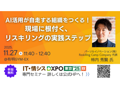 https://www.reskillingcamp.jp/ )事業責任者の柿内秀賢は、2025年11月27日(木)~11月28日(金)に有明GYM-EXにて開催される 「IT・情シスDXPO 東京’25 【秋】」の、11月27日(木)11:40~12:40のセッションに、「AI活用が自走する組織をつくる!現場に根付く、リスキリングの実践ステップ」をテーマに登壇することをお知らせします。