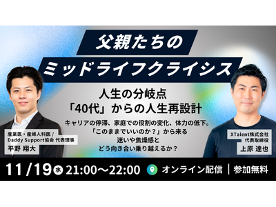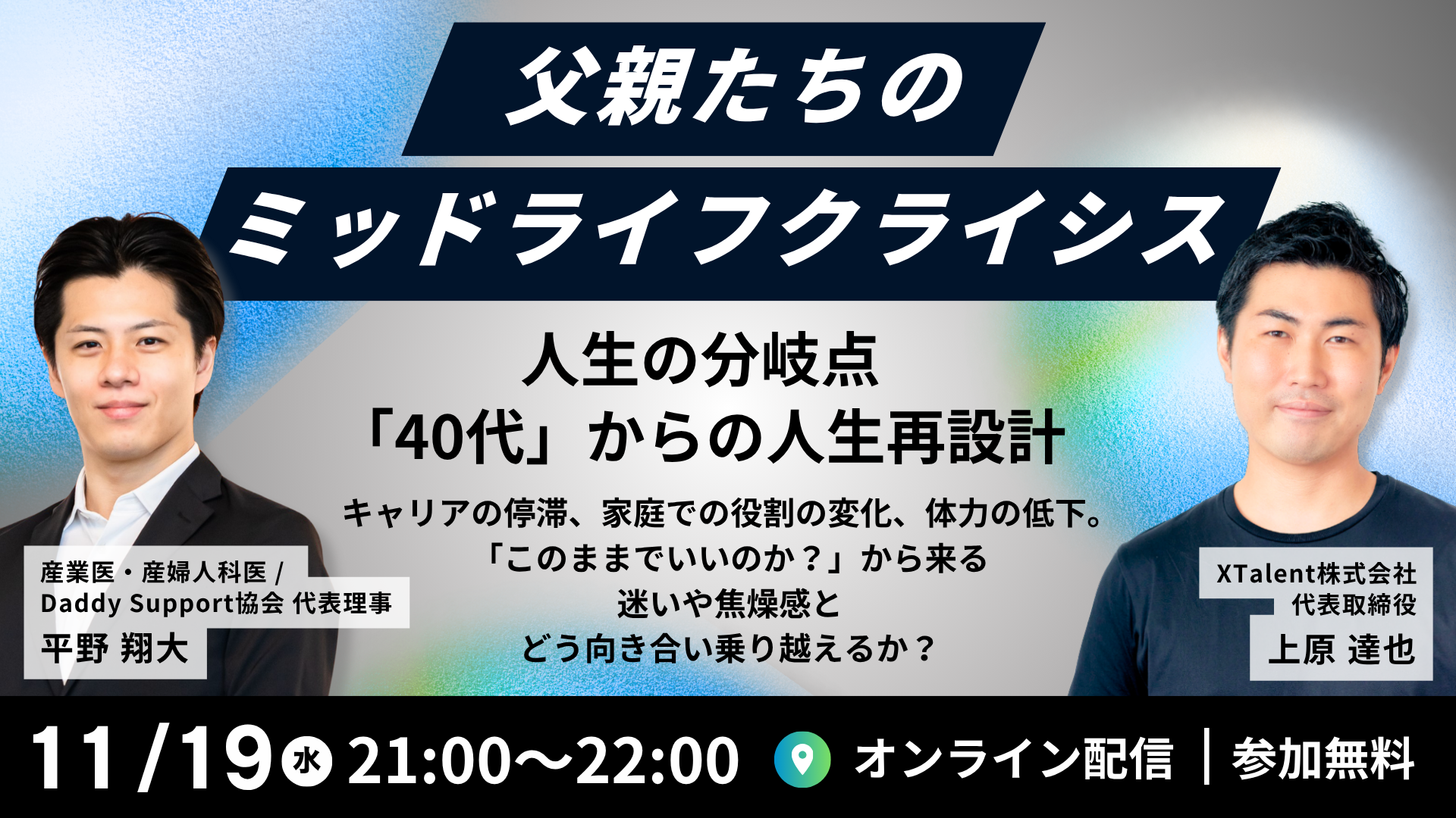 さらに、ワーキングペアレンツ向け転職サービスを運営するXTalent株式会社 代表取締役の上原達也が、キャリア支援の視点から、父親世代がこれからの人生をより豊かにするためのヒントをお届けします。