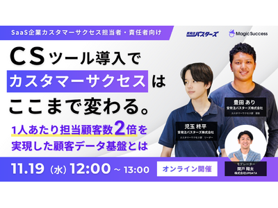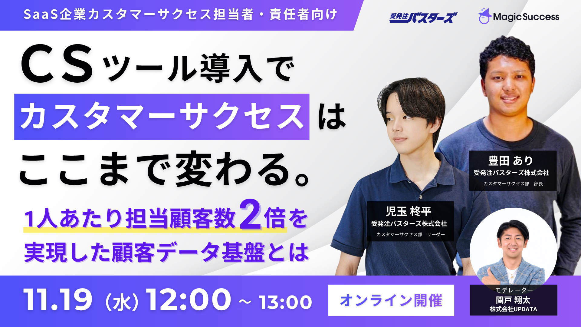 MagicSuccess(マジックサクセス)」を提供する株式会社UPDATA(本社:東京都港区、代表取締役:岡村雅信)は、2025年11月19日(木)に、カスタマーサクセス担当者向けのCSツール活用事例ウェビナーを開催いたします。
