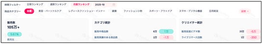 株式会社ベクトル(本社:東京都港区、代表取締役会長兼社長CEO:西江肇司、東証プライム:6058、以下ベクトル)傘下でTikTokコマースに特化した子会社となる株式会社ライブコマース(本社:東京都港区、代表取締役:森 勇気、以下ライブコマース社)では、「FastMoss(ファストモス)」を用いた2025年10月の最新市場動向を公開しました。