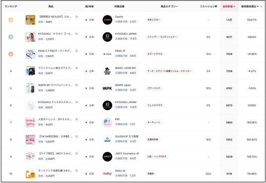 全体としては商品カテゴリー別のランク同様に「美容・パーソナルケア」「スマホ・デジタル機器」「おもちゃ・ホビー」系の商品が上位を占めていますが、中でもTikTok Shop限定商品、TikTokライブ販売限定 商品が上位ランキングに入ってくる傾向があります。
