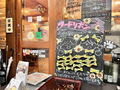 飲食店を利用するお客様がこどもの1食分として1つ300円のリボンを先払い購入し、お店に掲示します。こどもたちがその掲示されているリボンを1つ取って、お店の人に渡すことで、無料で1食分の食事ができる仕組み。