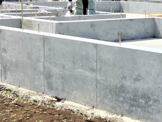 住宅の基礎工事において一般的な、ベタ基礎の底盤と立ち上がり部を1回の打設で一体化する「ベタ基礎コンクリート一体打ち工法」は、少数棟現場において合理的な施工方法です。作業を1日で完了できることに加え、打ち継ぎ部が生じないことから、工期の短縮と基礎構造体の高品質化が期待できます。