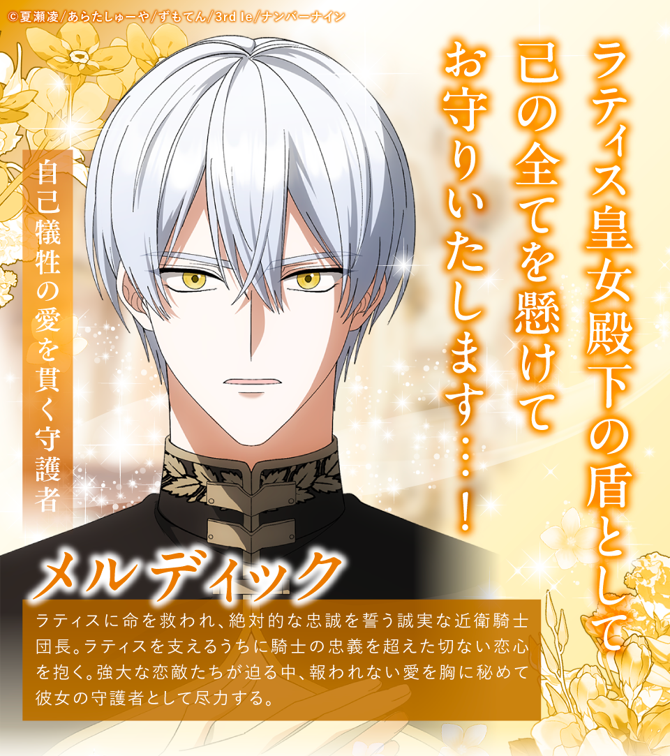 ラティスに命を救われ、絶対的な忠誠を誓う誠実な近衛騎士団長。ラティスを支えるうちに騎士の忠義を超えた切ない恋心を抱く。強大な恋敵たちが迫る中、報われない愛を胸に秘めて彼女の守護者として尽力する。