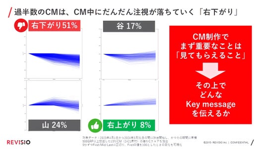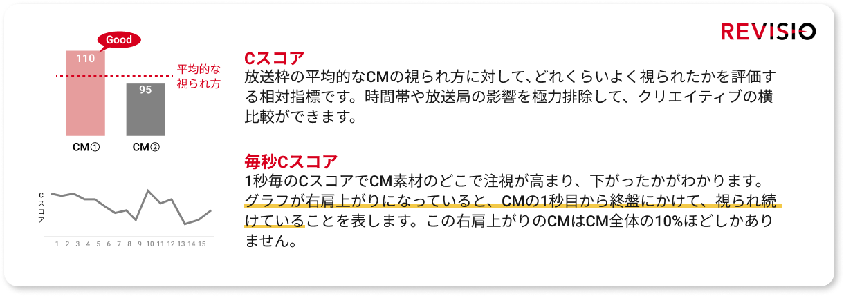 REVISOでは、14万本以上のCMのアテンションデータを蓄積しているため、「CMの視られる要素」と「視聴者に視られるためのCMづくり」のノウハウを持っています。