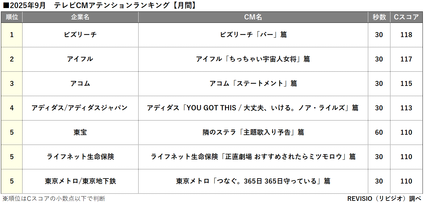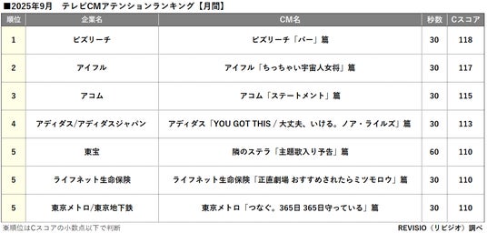 ご家庭に人体認識技術を搭載した機器を設置し、テレビスクリーンの「注視」を測るREVISIO株式会社(旧TVISION INSIGHTS株式会社、所在地 :東京都千代田区、代表取締役社長 郡谷 康士、以下REVISIO)は、 2025年9月に放送されたテレビCMを独自の「アテンション(注視)データ」で分析し、視聴者の視線をくぎづけにしたテレビCMのランキングを公開しました。