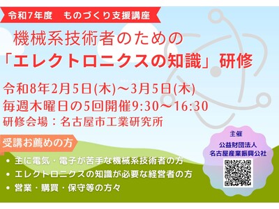 エレクトロニクスの知識が必要であるが、苦手意識を持つ機械系技術者や営業、購買等の担当者を対象に、最小限必要な事項を選定し、極力平易に解説する講義と、理解を深めるための実習から成る基礎研修です。
