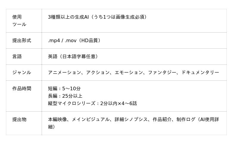 WAIFFの特徴は、単なる技術展示ではなく「AIを物語にどう統合するか」を重視している点です。応募作品には3種類以上の生成AIツールの使用(うち1つは画像生成必須)が求められ、AIが創造性の本質的かつ革新的な要素として機能しているかどうかが評価基準となります。