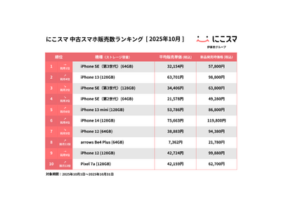 中古スマートフォンの個人向け販売・買取サービス「にこスマ」を運営する株式会社Belong(本社:東京都港区、代表取締役社長:西村 耕一郎 以下、「Belong」)は、「にこスマ」における2025年10月の中古スマホ/機種別販売数・買取数ランキングを発表します。