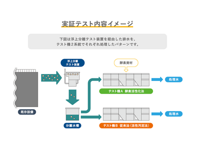 1.既存設備から直接取水した排水、および浮上分離テスト装置を経由した排水の2種類を、従来の活性汚泥法と本システムの酵素活性化法の2系統の小型テスト機を用いて処理し測定します。