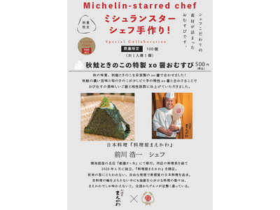 空堀商店街"(谷町六丁目駅~松屋町駅)の人気おむすび屋さん『おびむす』では、関西を代表するミシュランスターシェフが調理した具材を使用するミシュランおむすびを月替わりで提供しています。スターシェフ"監修"ではなく、シェフが"実際に"調理した具材を具としておにぎりを握る!そんな夢のコラボが実現。今回のコラボは京都『料理屋まえかわ』前川浩一シェフが手がける秋の味覚、秋鮭ときのこを味わえる「秋鮭ときのこの特製xo醤おむすび」。11月7日から100個の完全数量限定で500円のワンコインでご提供!ぜひこの機会にミシュランの味をご賞味ください。