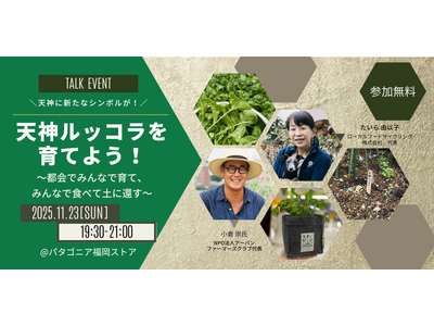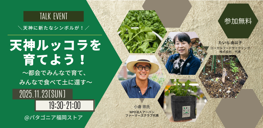 キックオフイベントとして、2025年11月23日(日)にパタゴニア福岡ストアにて「天神ルッコラを育てよう!」を開催し、「渋谷ルッコラ」の生みの親であるアーバンファーマーズクラブ代表の小倉崇氏を迎えて、都市の循環と種の未来について語り合います。