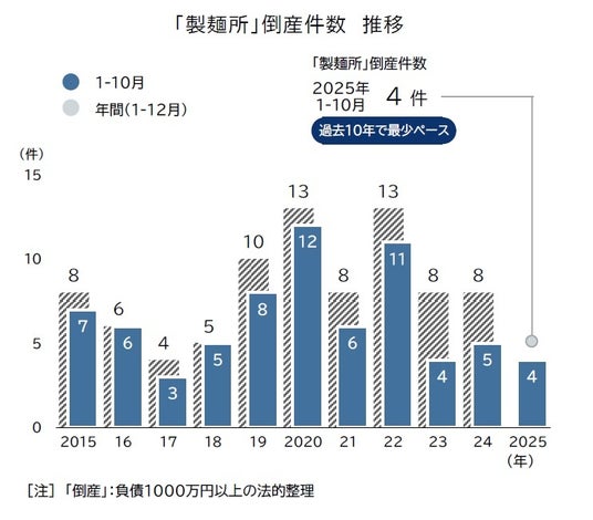 2025年1-10月に発生した「製麺所」の倒産(負債1000万円以上、法的整理)は4件にとどまった。外食向けの売り上げ減少と原材料コストの急騰で過去最多を記録した2022年(年間13件)の3分の1の水準となり、2017年(同4件)と並び、過去10年で最少ペースで推移している。小規模な製麺所の廃業など、実際はより多くの製麺所が市場から退出したとみられるが、製麺所の経営環境は改善傾向にある。