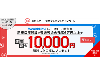 今回は、“何から始めたら良いか分からない。”と思っている方でも将来の資産形成に向けて簡単に資産運用を始められるよう、WealthNavi for 三菱UFJ銀行の新規口座開設と普通預金口座残高60,000円以上を条件に、運用資金10,000円をプレゼントするキャンペーンを10月1日(水)に開始しました。