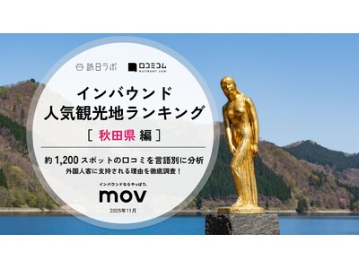 業界最大級のインバウンドビジネスメディア「訪日ラボ」及び 店舗向け集客一元化プラットフォーム「口コミコム」を運営する株式会社mov(代表取締役:渡邊 誠、本社:東京都渋谷区、以下mov)は、秋田県の観光地に寄せられた最新の口コミデータから、独自の『インバウンド人気観光地ランキング』を発表しました。