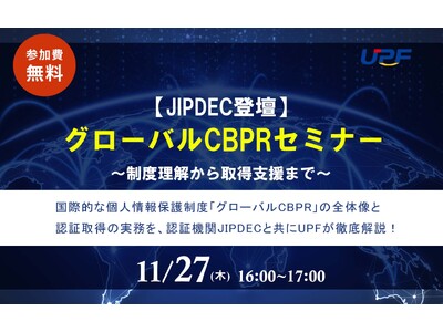 リスクマネジメント分野のコンサルティングサービスを提供する株式会社UPF(本社:東京都中央区、代表取締役:仲手川 啓、以下当社)は、一般財団法人日本情報経済社会推進協会(JIPDEC)をゲストに迎え、『グローバルCBPR(Global Cross-Border Privacy Rules)』の仕組みや取得プロセスを解説する無料オンラインセミナーを、2025年11月27日(木)に開催します。