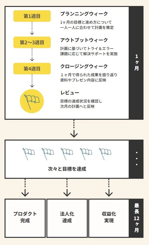 プロダクト完成までの期間は6~12ヶ月。1ヶ月ごとのカリキュラムと週次のアクションが設定され、コミュニケーターが専用のコミュニケーションツール(Slack)を用いてガイドします。