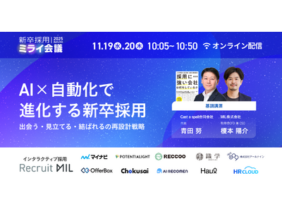 インタラクティブ採用で企業と学生の「相互理解」を支援するMIL株式会社(本社:東京都新宿区、代表取締役CEO:光岡 敦、以下 MIL)は、2025年11月19日(水)・20日(木)に、オンラインカンファレンス「新卒採用ミライ会議 2025 秋」を開催いたします。