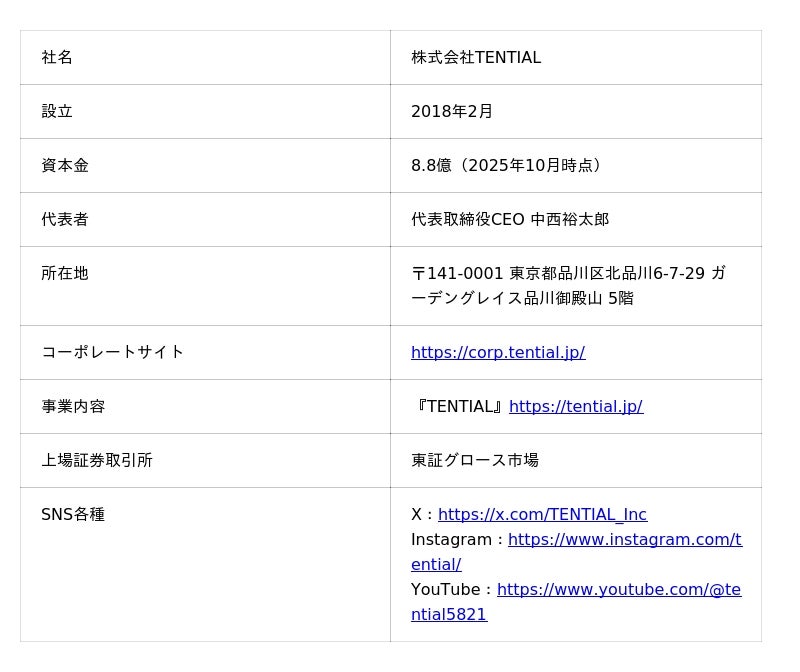 株式会社TENTIALは、「健康に前向きな社会を創り、人類のポテンシャルを引き出す。」をミッションに掲げ、コンディショニングブランド『TENTIAL』を運営しています 。代表取締役CEO中西裕太郎は、プロサッカー選手を目指した高校時代に病気で夢を絶たれた原体験から、自身のポテンシャルを最大限に発揮するためには健康と日々のコンディショニングが不可欠であると痛感 。この経験から株式会社TENTIALを創業し、世の中に「コンディショニングを実装する」ことを目指しています。
