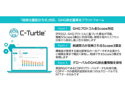 株式会社NTTデータ(代表取締役社長 鈴木 正範、以下「NTTデータ」)とNTTビジネスソリューションズ株式会社(代表取締役社長 木上 秀則、以下「NTTビジネスソリューションズ」)は、株式会社阿波銀行(代表取締役頭取 福永 丈久、以下「阿波銀行」)に、金融機関およびその投融資先を対象とした温室効果ガス(以下「GHG」)排出量可視化プラットフォーム「C-Turtle FE(シータートル エフイー)」を提供し、阿波銀行の投融資先に「C-Turtle(R)※1(シータートル)」を提供します。C-Turtle FEの導入は、徳島県に本店を置く金融機関としては初めてです。NTTビジネスソリューションズおよびNTTデータは、阿波銀行との連携を通じて、地域企業が自社のGHG排出量を把握し、データに基づいた経営判断を可能とする環境の整備を進めます。これにより、地域の脱炭素経営の実現を推進し、持続可能な社会の構築に貢献します。