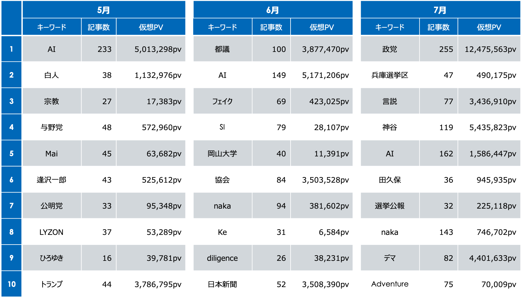 8月は政治の話題や社会的な出来事よりも、AIでファクトチェックを行う機能を含んだシステム・ツールの発表がトレンドに多く入りました。とくにNTT東日本株式会社とNABLAS株式会社による技術開発と実証実験のニュースが高いPVを得ています。AI生成による「なりすまし電話」検知技術の開発や、自治体向けの偽・誤情報拡散を防ぐためのシステム構築が主な内容です。