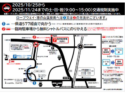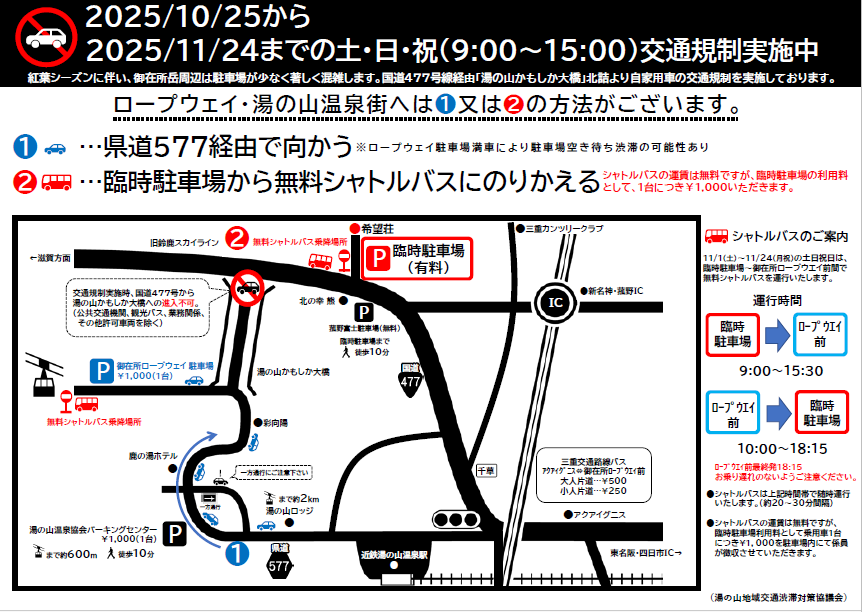 マイカーでお越しの方は臨時駐車場をご利用のうえ、シャトルバスで湯の山温泉・御在所ロープウエイ前までお越しください。スムーズに移動いただけます。