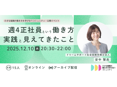 この度、特定非営利活動法人ArrowArrow(代表理事:海野千尋)と一般社団法人りぷらす(代表理事:橋本大吾)による協働プロジェクトである「小さな組織の働き方を学び合うコミュニティ」において、公開イベントとして2025年12月10日(水)に【週4正社員という働き方ー実践と見えてきたこと】をオンラインにて開催いたします。