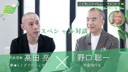 子供の笑顔を育む先進的な取組を行っている企業・団体を表彰する「こどもスマイルムーブメント大賞」。アンバサダーの野口聡一さんが、令和5年度に最優秀賞を受賞した、一般社団法人夢らくざプロジェクトの代表と対談し、受賞の背景や受賞後の変化、子供たちの夢を育む取組に迫ります。※同賞の令和7年度の表彰式を12月に予定しています。