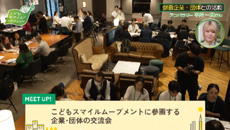 こどもスマイルムーブメントに参画する企業・団体の交流会「MEET UP!」。アンバサダーの平井一夫さんが、本年10月に開かれた「MEET UP!」の会場を訪れました。平井さんは、子供たちの笑顔につながる取組を企業・団体が広めるうえでのヒントについてお話され、参画企業・団体の熱気が伝わる内容となっています。
