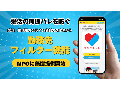 東京都認証 特定非営利活動法人 結婚相談NPO(所在地:東京都武蔵野市)が企画・監修を担当し、株式会社ロジナス(所在地:神奈川県逗子市)が開発・運営を担当する出会いの信用情報サービス「カスタネット」(基本無料)は、勤務先の同僚バレを防ぐ機能「勤務先フィルター」を賛助会員法人に限定して提供しておりますが、この度、同機能をNPO法人に無償提供することを決定致しました。